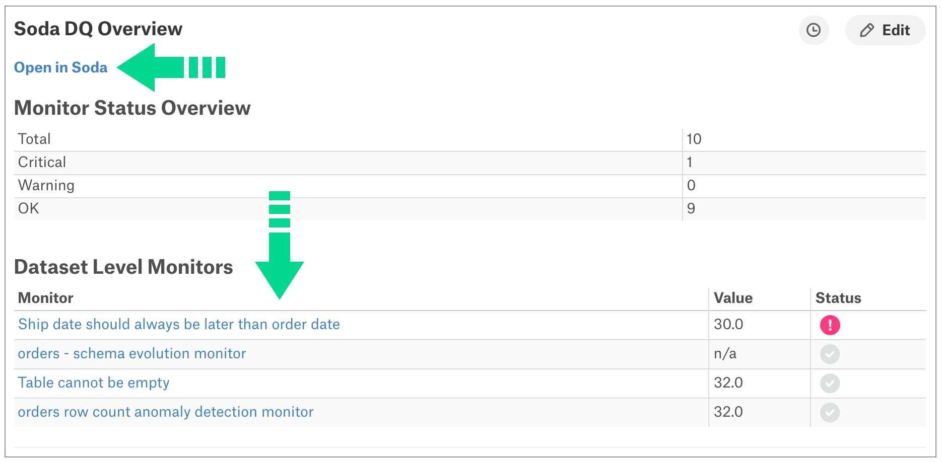 Under the Soda DQ Overview heading in Alation, click Open in Soda to access the dataset page in Soda Cloud.