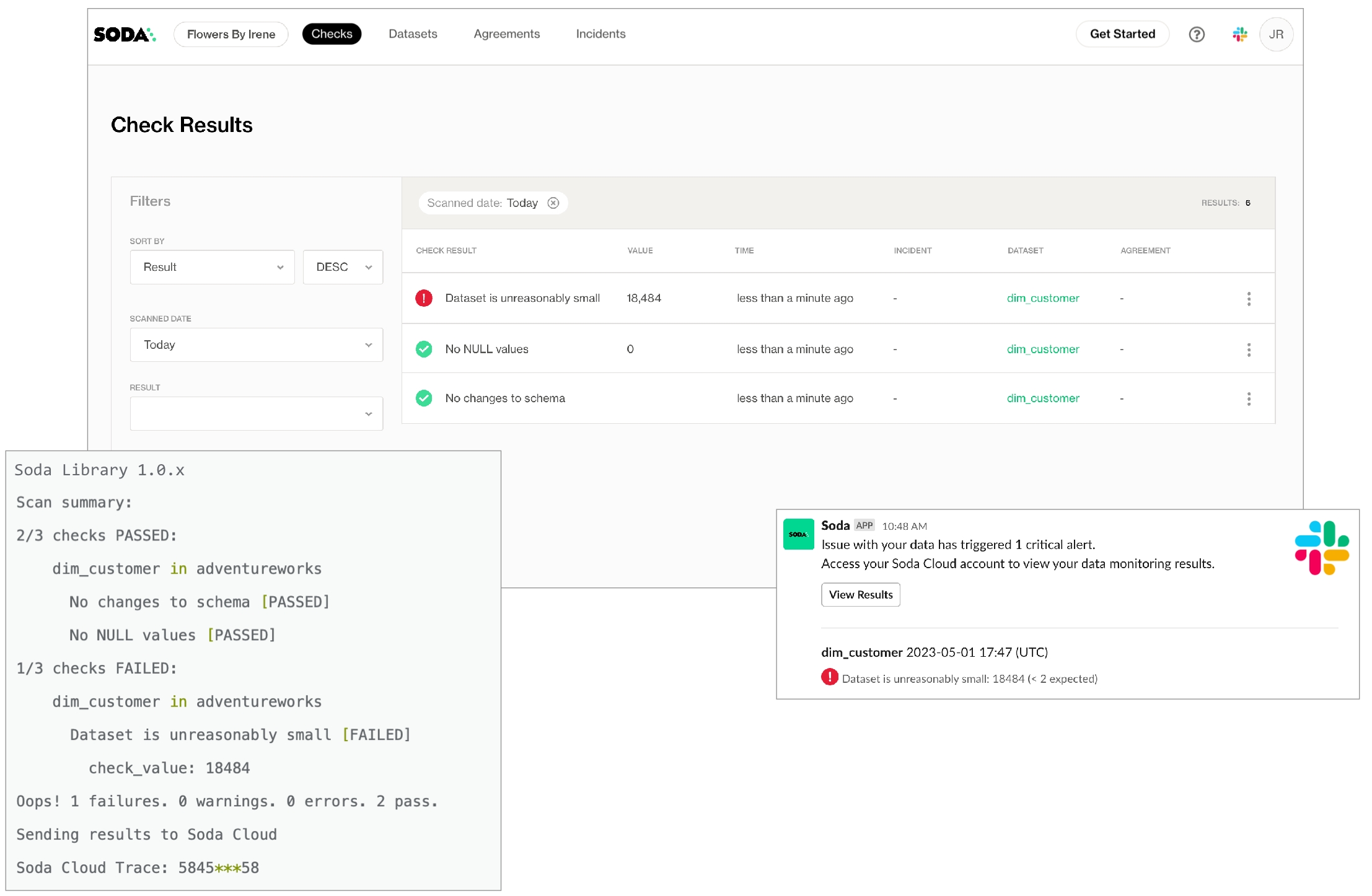 Soda makes the results available in the command-line and in your online account, and notifies you of failed checks by email, Slack, MS Teams, or any messaging platform your team already uses.