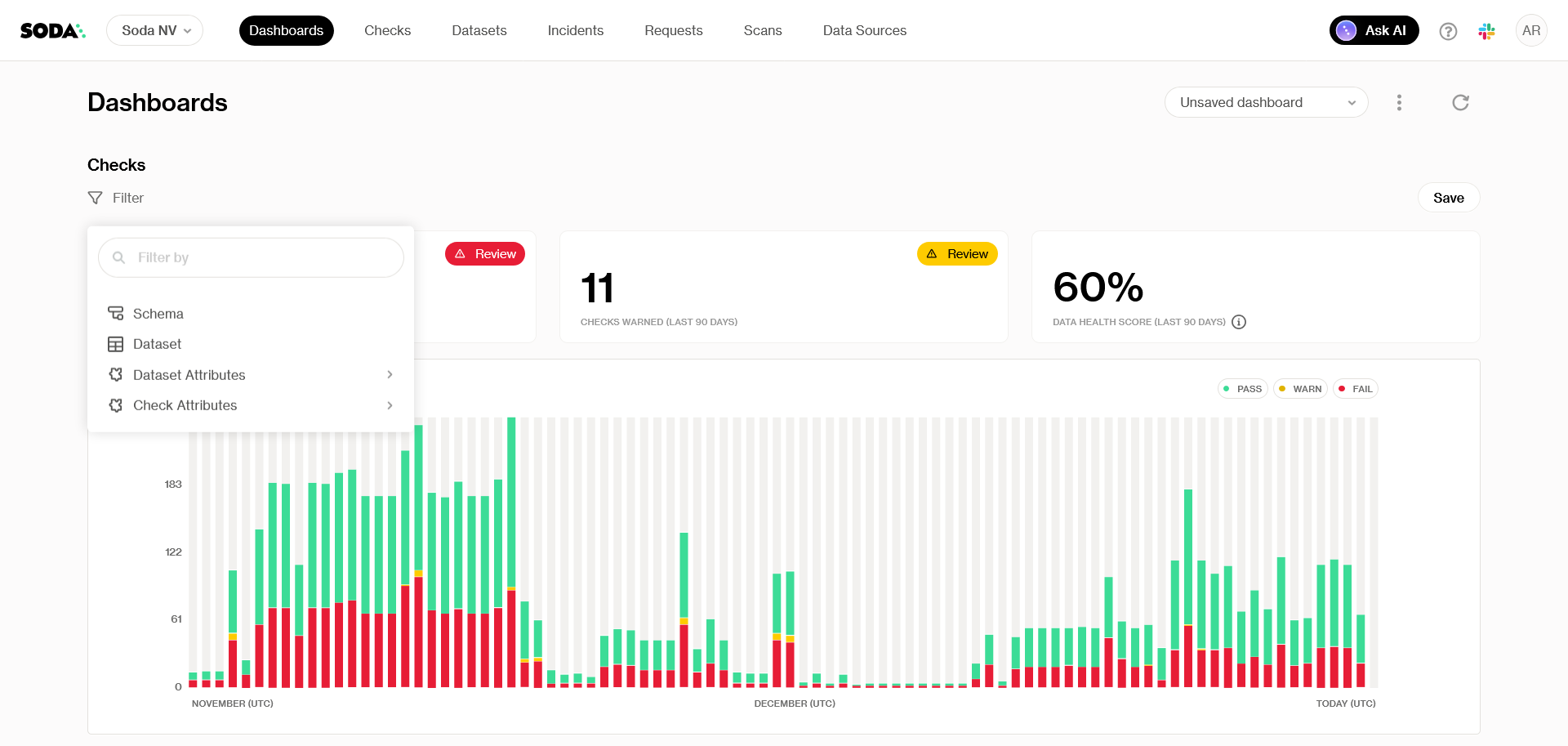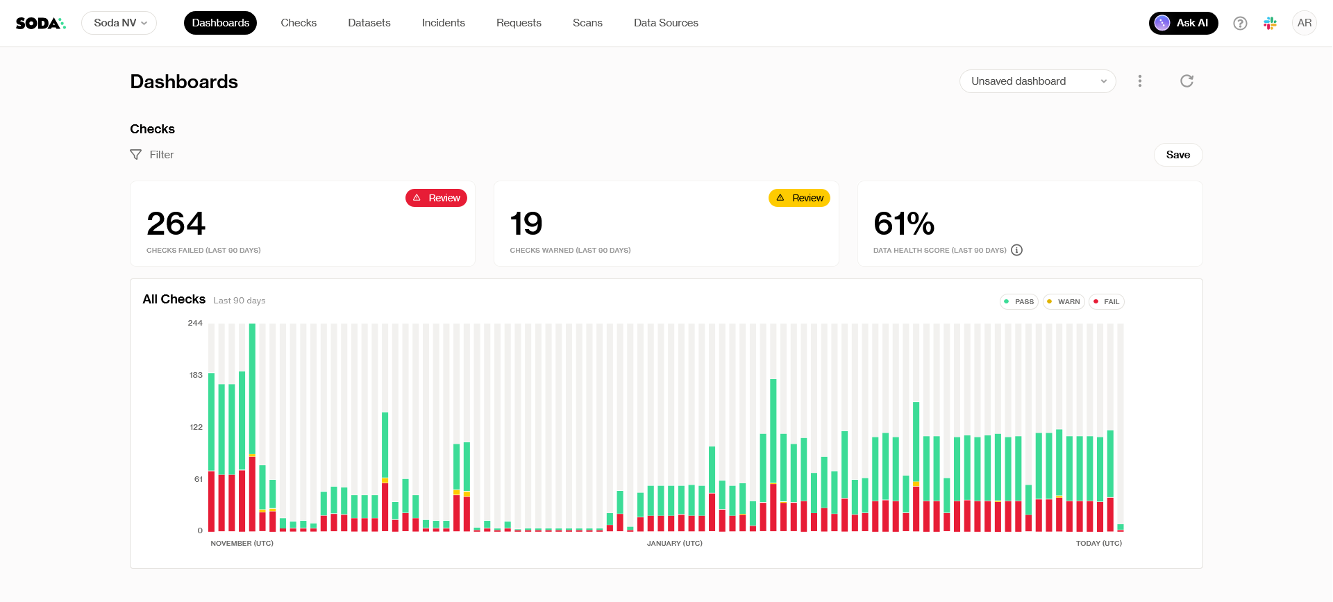 The **Organization Dashboard** provides a high-level overview of your data quality across datasets and checks in Soda Cloud. It shows key trends over time, such as the number of checks that are passing, failing, or in a warning state, helping you identify issues early.