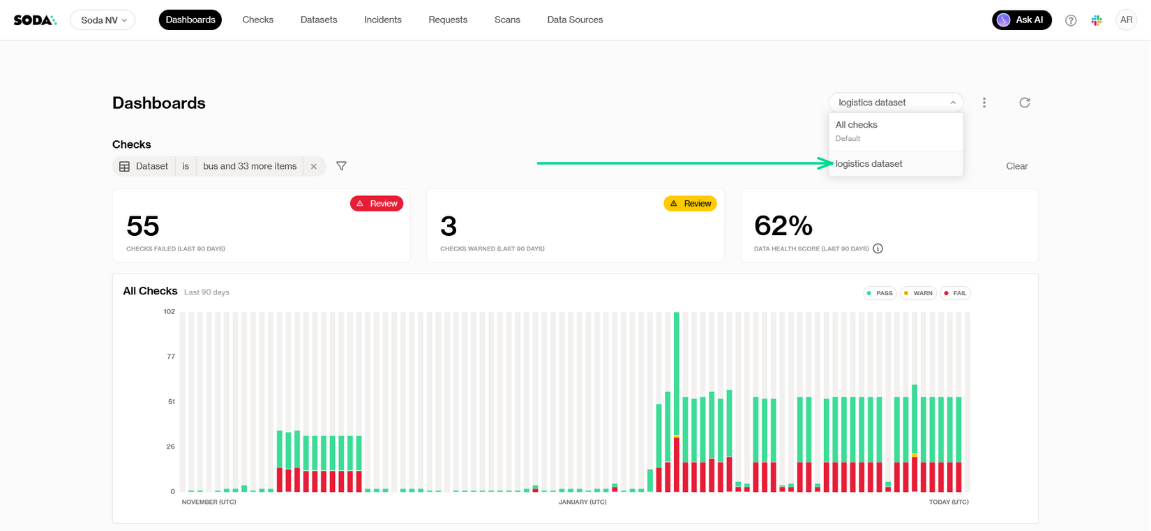 In addition to the built-in dashboards in Soda Cloud, you can build **custom dashboards** tailored to your organization’s specific needs. By leveraging the **Soda REST API**, you can programmatically retrieve data quality metrics, check results, and incident details, and integrate them into external dashboarding tools such as Power BI, Tableau, or Looker.