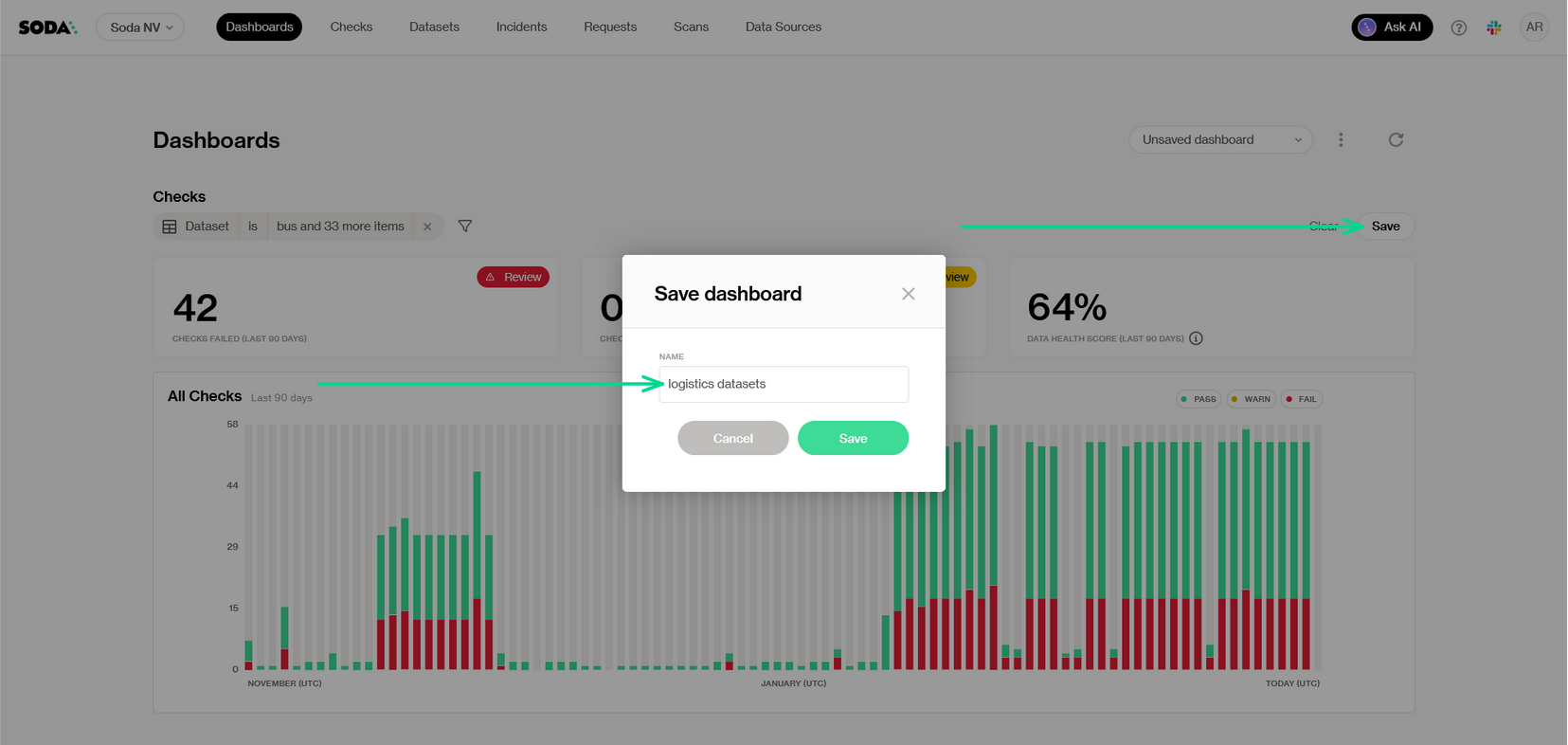 * **Scans in failed mode**: Datasets that are currently blocked due to failing checks.