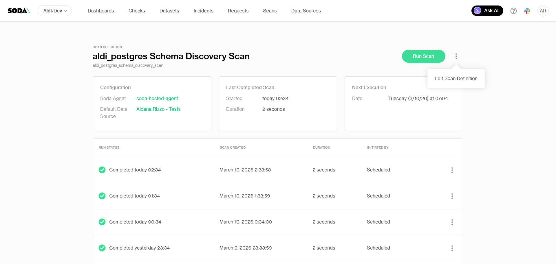 Refresh dataset discovery: Soda runs discovery scans hourly to get the latest view of tables and schemas within a data source. By pressing on the icon on the top right of the page, you can run the scan on demand.
