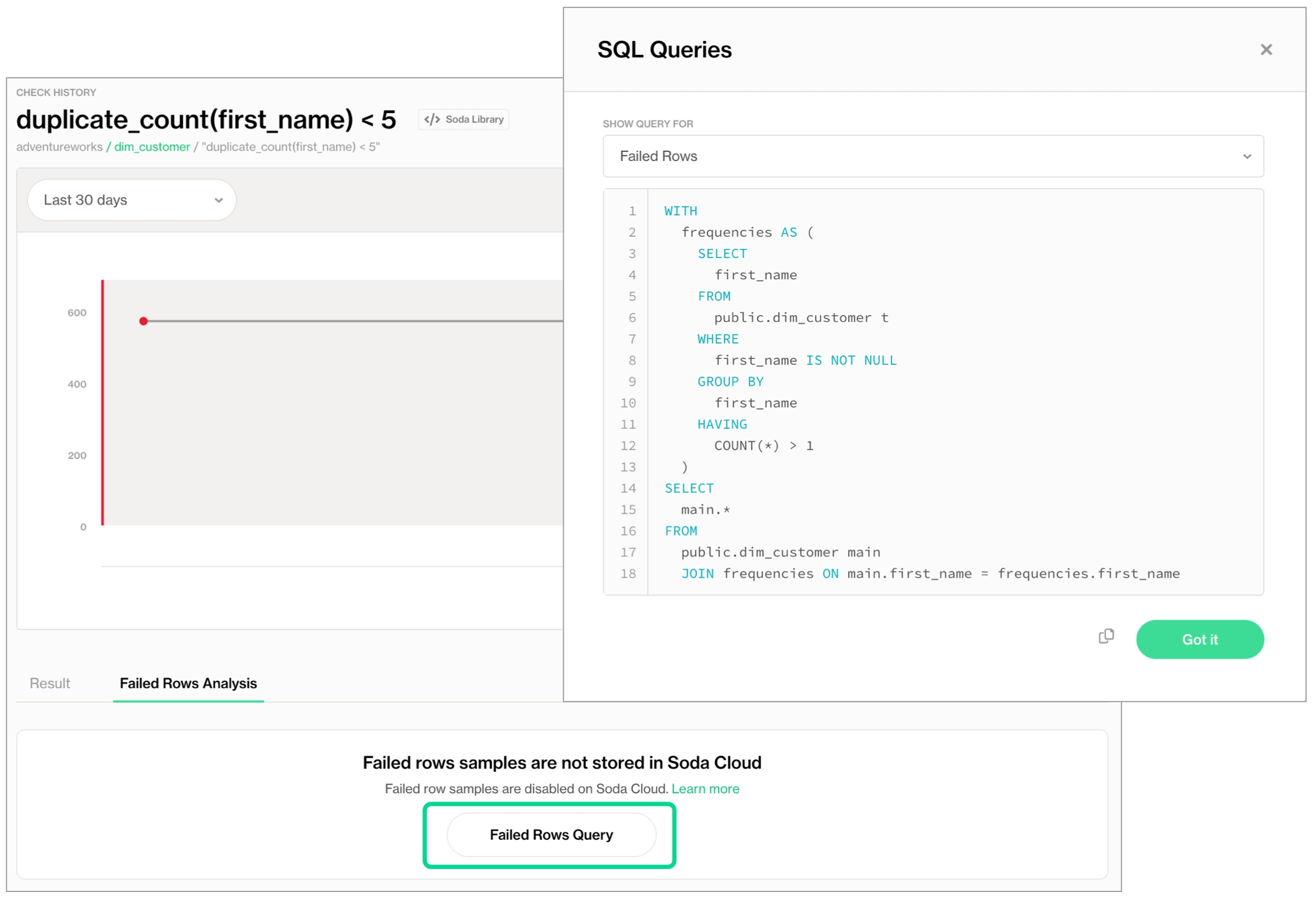 There are two ways Soda collects and displays failed row samples in your Soda Cloud account.