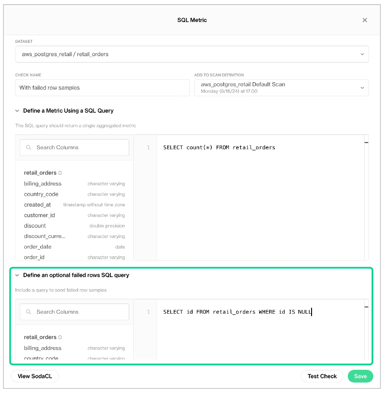 configuration. (A missing metric in a check implicitly collects failed rows samples.)