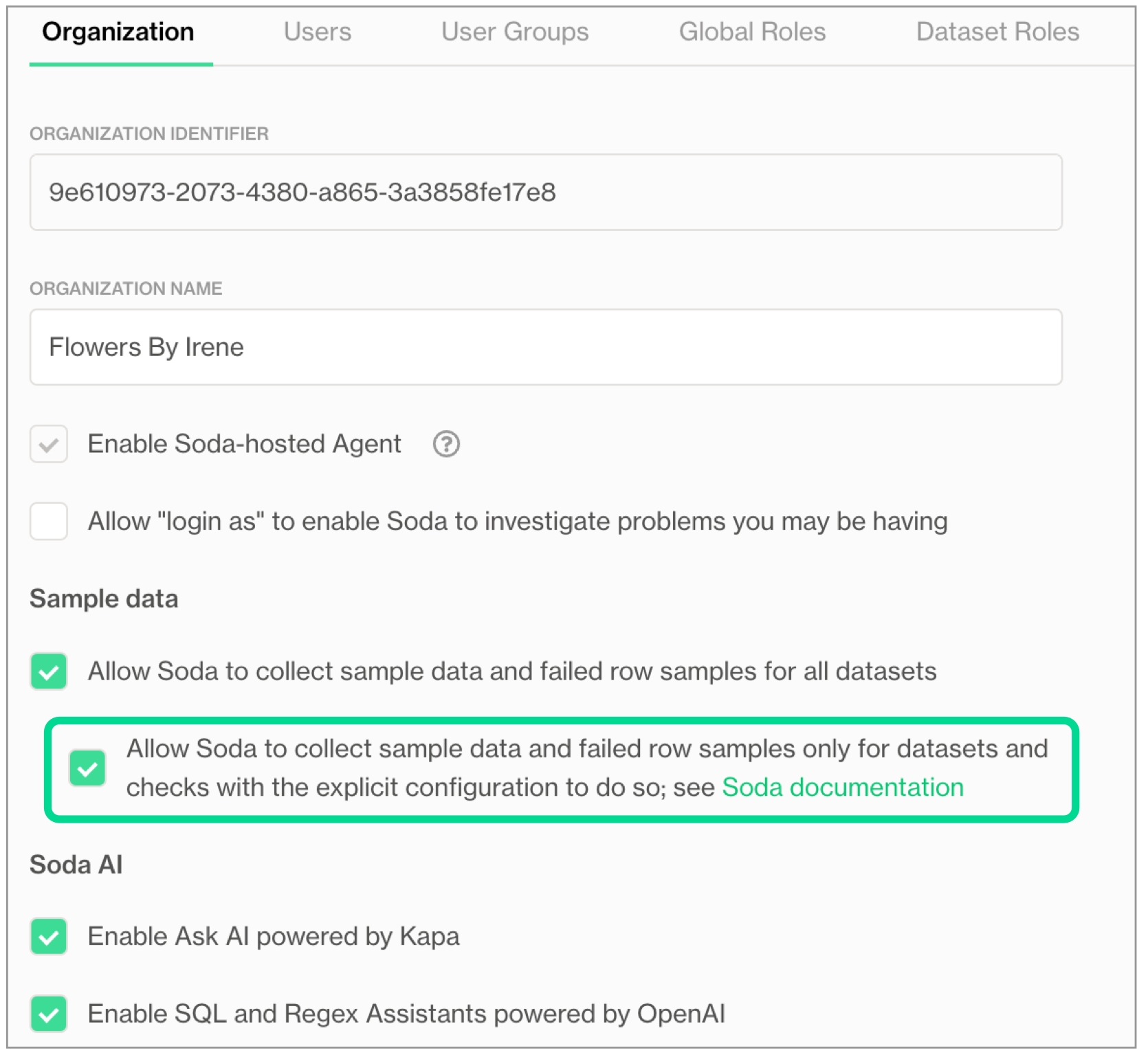 (Optional) Soda Library 1.6.1 or Soda Agent 1.1.27 or greater Check the nested box to Allow Soda to collect sample data and failed row samples only for datasets and checks with the explicit configuration to do so to limit both dataset sampling and implicit failed row collection to only those checks which have configured