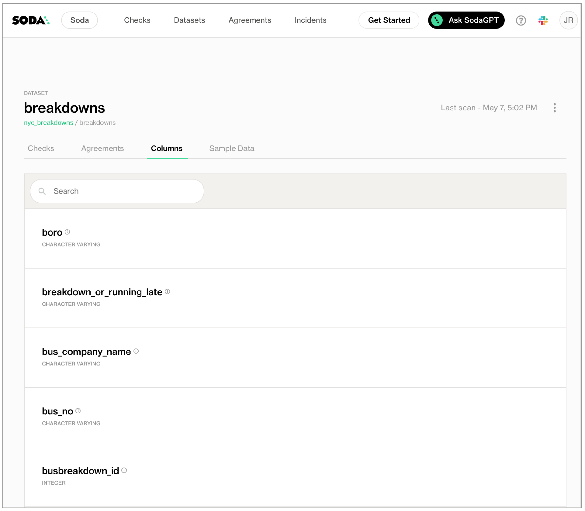 Navigate to the Datasets dashboard, then click a dataset name to open the dataset's info page. Access the Columns tab to review the datasets that Soda Library discovered, including the type of data each column contains.
