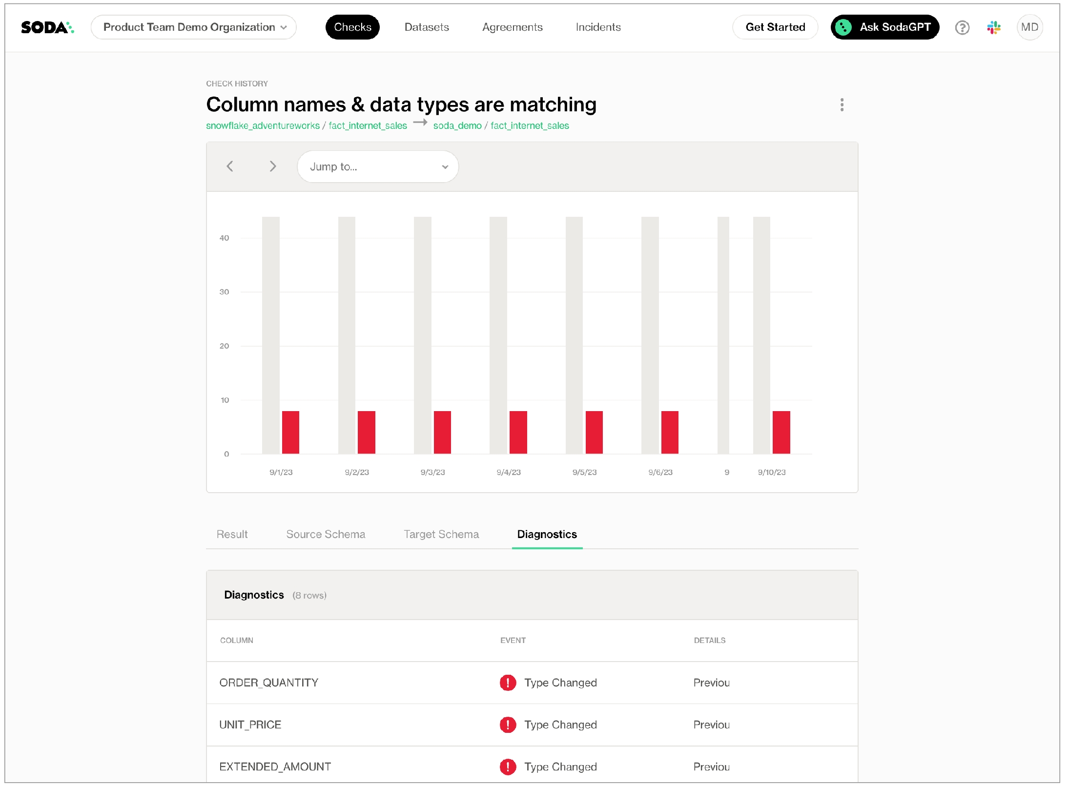 A schema reconciliation check compares the columns of two datasets to reveal any differences between target and source; where the columns names differ, or the data type has changed, Soda registers a mismatch and the check fails.