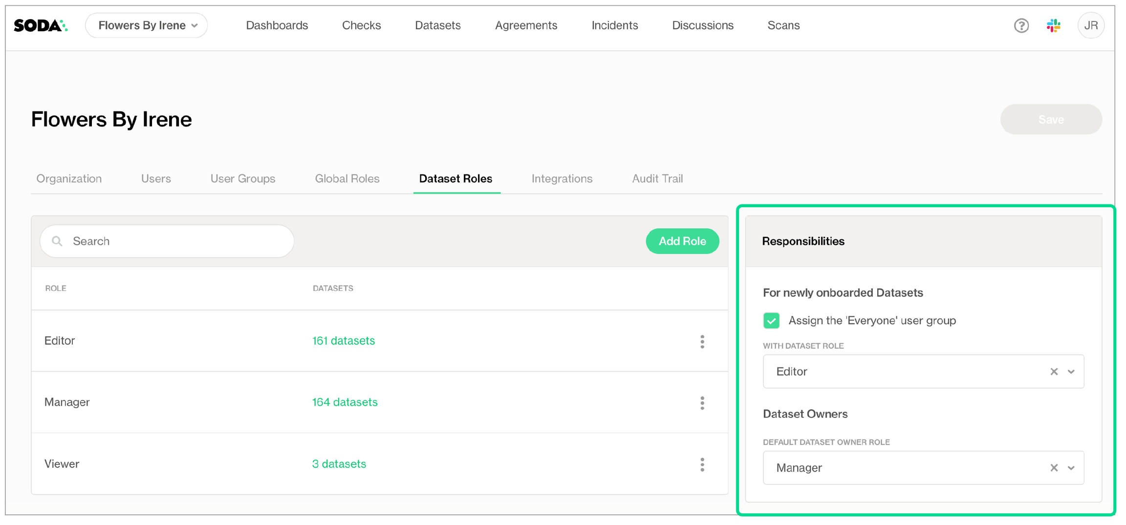 When any user uses Soda Library or Soda Cloud to add a new data source, and its datasets, to the Soda Cloud account, the user automatically becomes the Dataset Owner of each dataset in the data source. Depending upon the Responsibilities settings in the Dataset Roles tab of Organization Settings, the Dataset Owner is assigned a role according to the Default Dataset Owner Role setting.