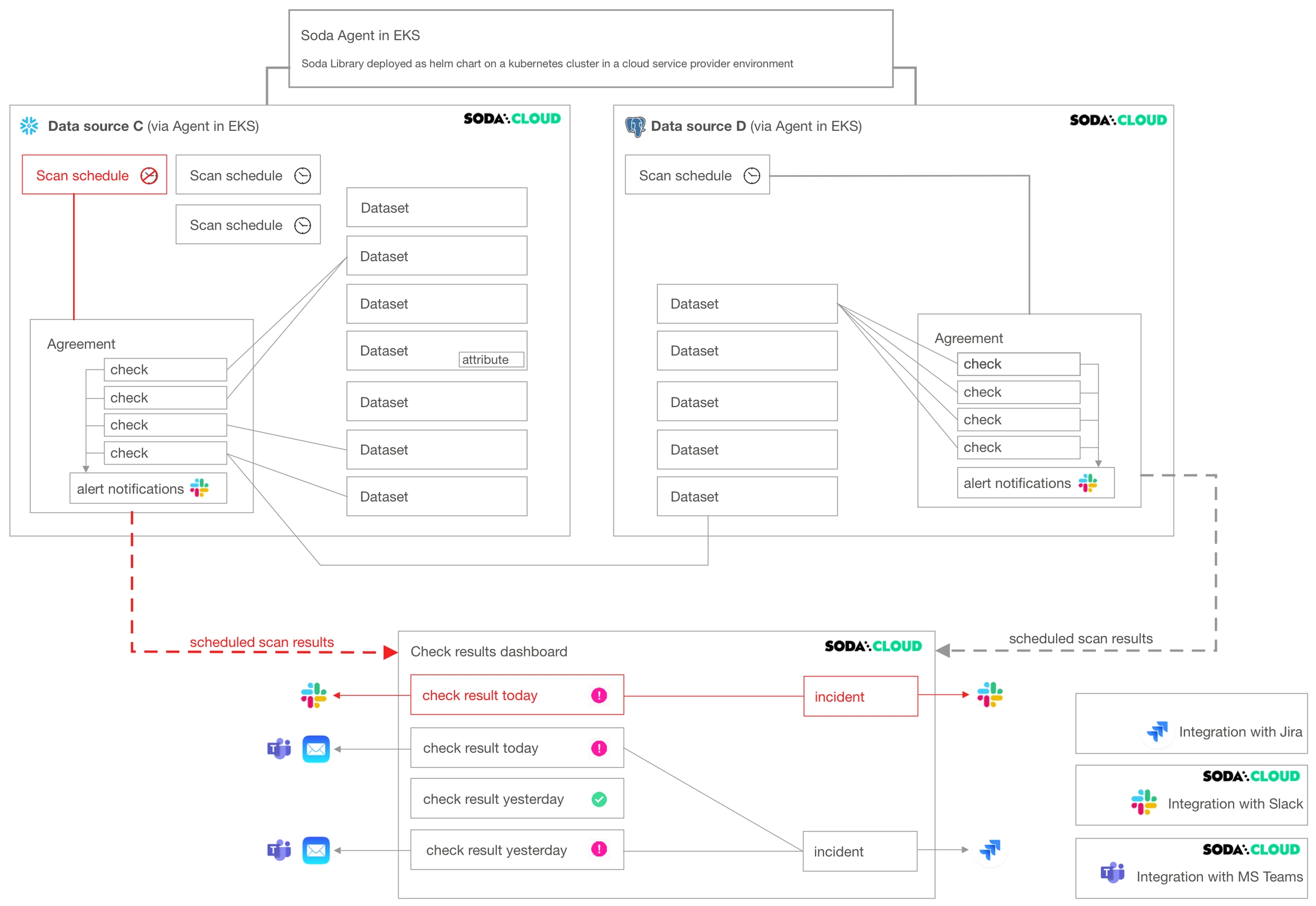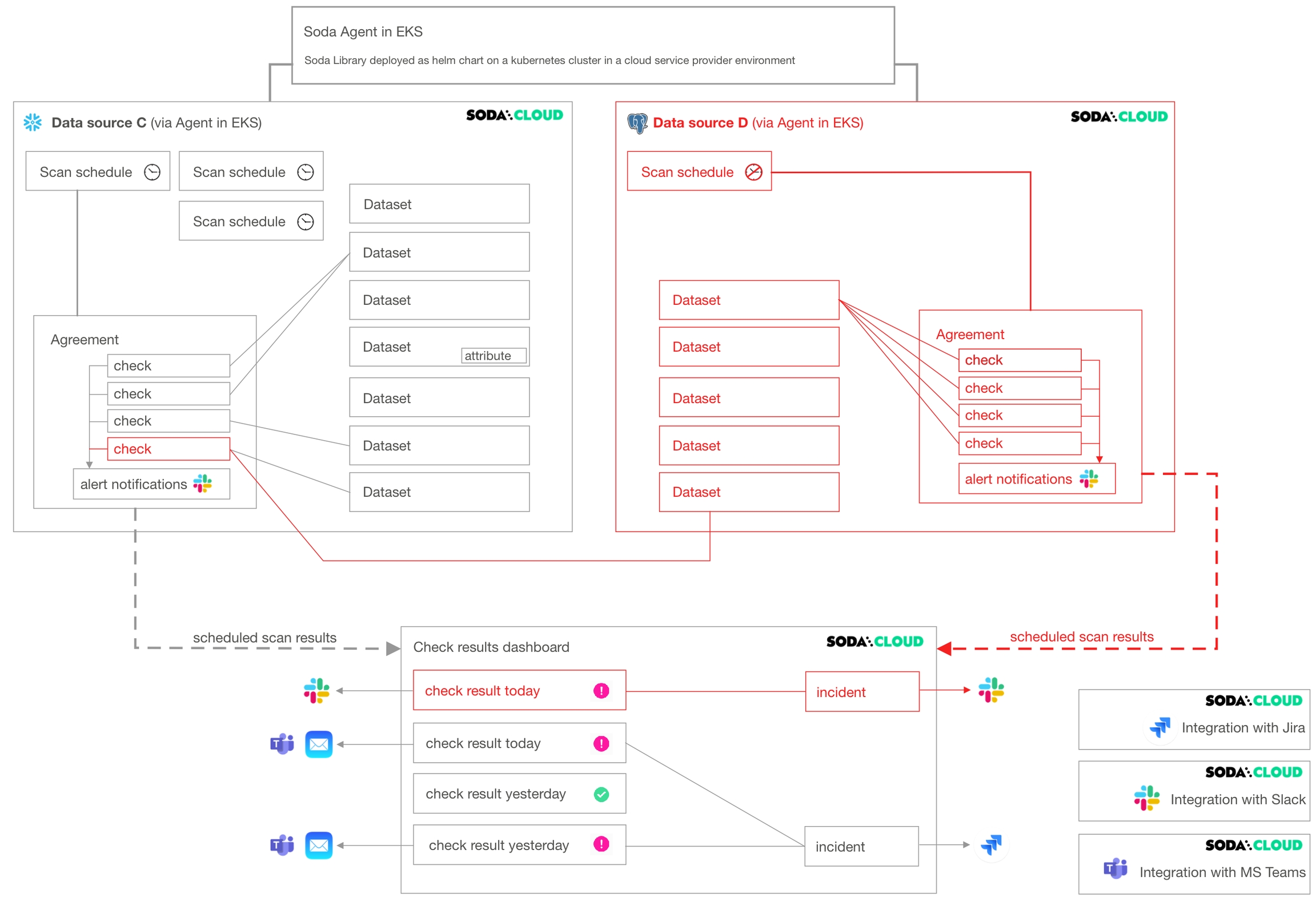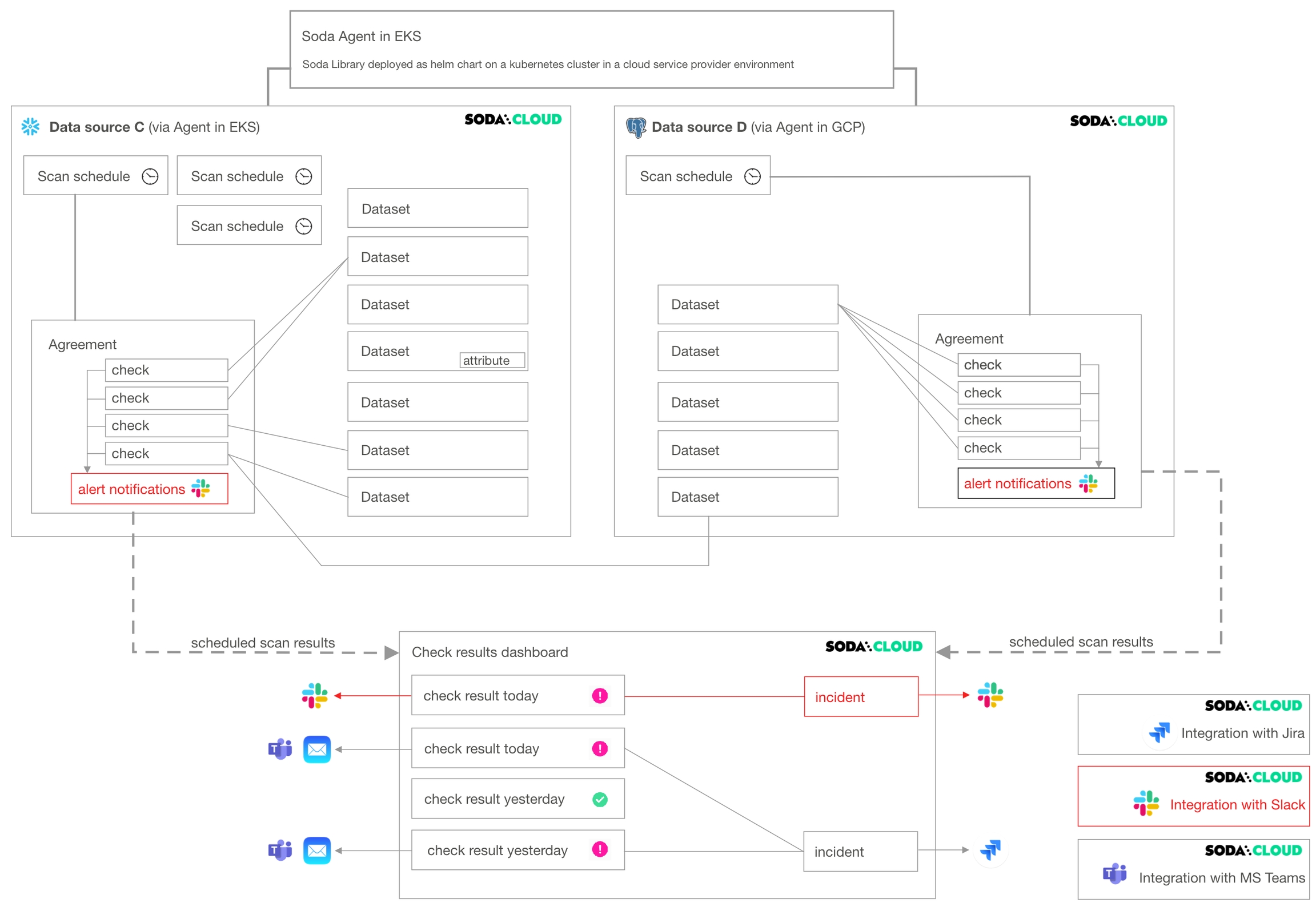Soda Library connects to data sources and performs scans of each dataset in a data source. When you connect Soda Library to a Soda Cloud account, it pushes scan results to Soda Cloud where users in your organization can view check results, access Cloud Metric Store data, and integrate with Slack to investigate data quality Incidents.