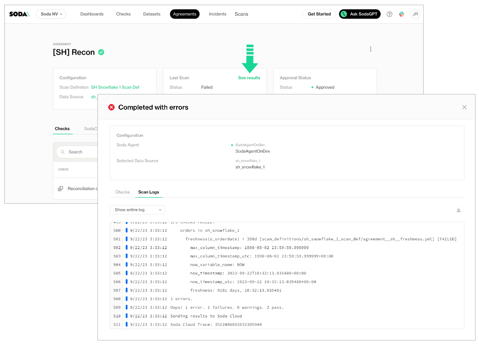 In the Agreement dashboard, click See results in the Last scan tile, then click the Scan Logs tabs.