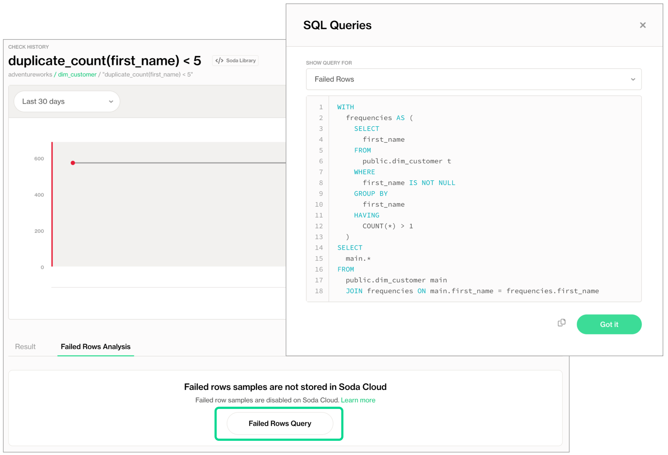 If disabled for a dataset, Soda executes the check during a scan and does not display any failed rows in the Check History page. Instead, it displays an explanatory message and offers the failed rows SQL query that a user with direct access to the data can copy and run elsewhere to retrieve failed row samples for the check.
