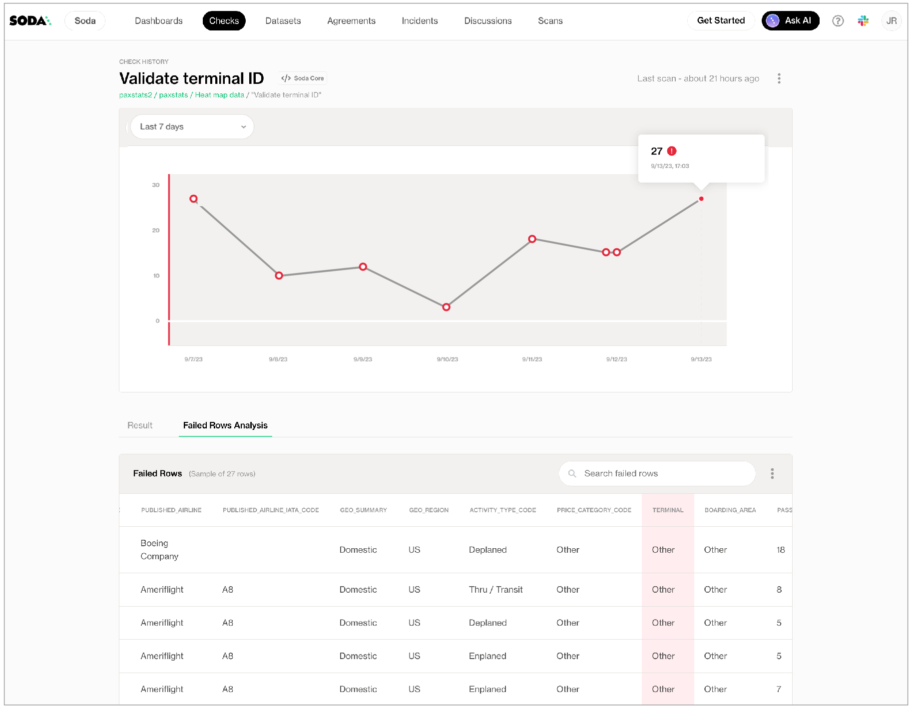 When a Soda scan results in a failed check, Soda Cloud displays details of the scan results in each check's Check History page. To offer more insight into the data that failed a check during a scan, you can enable Soda Cloud to display failed rows samples in a check's history.