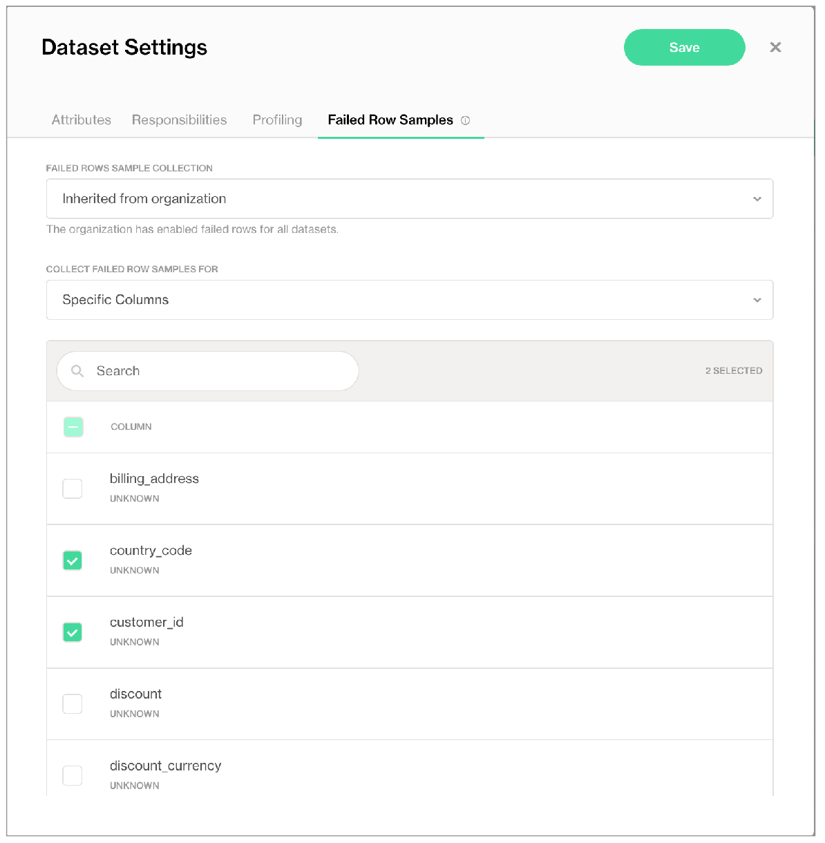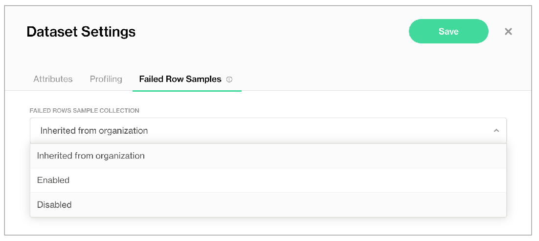 sample columnsorcollect failed rowsparameters, or to datasets configured to collect failed row samples in the Dataset Settings. This setting does not apply to checks that explicitly collect failed row samples.Save the settings.