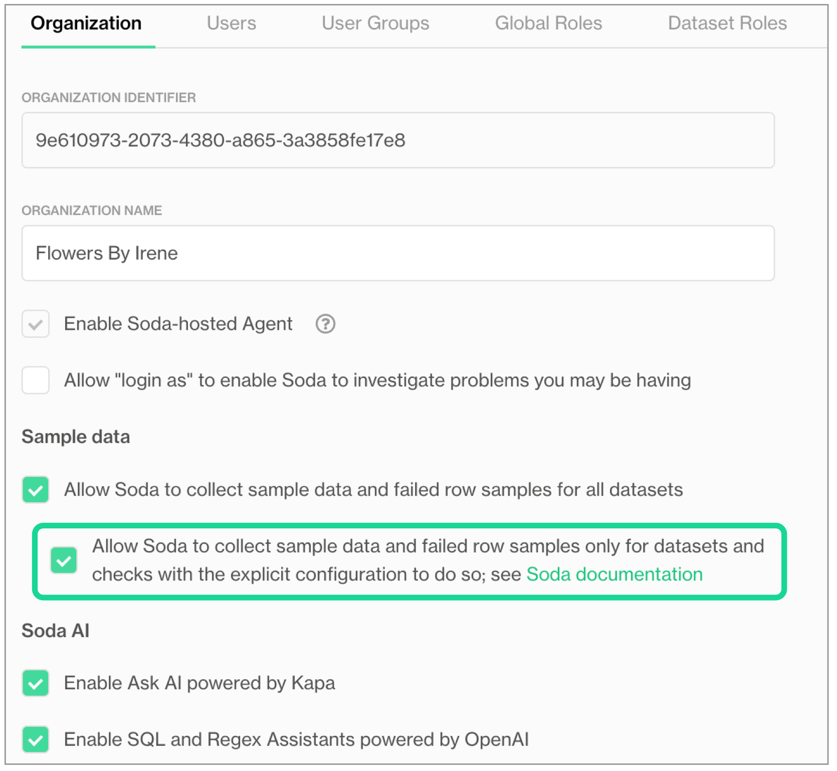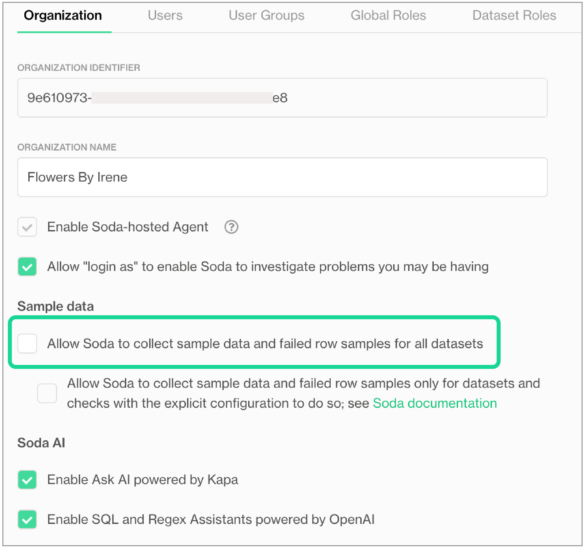 UNCHECKED Organization Settings > Allow Soda to collect sample data and failed row samples for all datasets