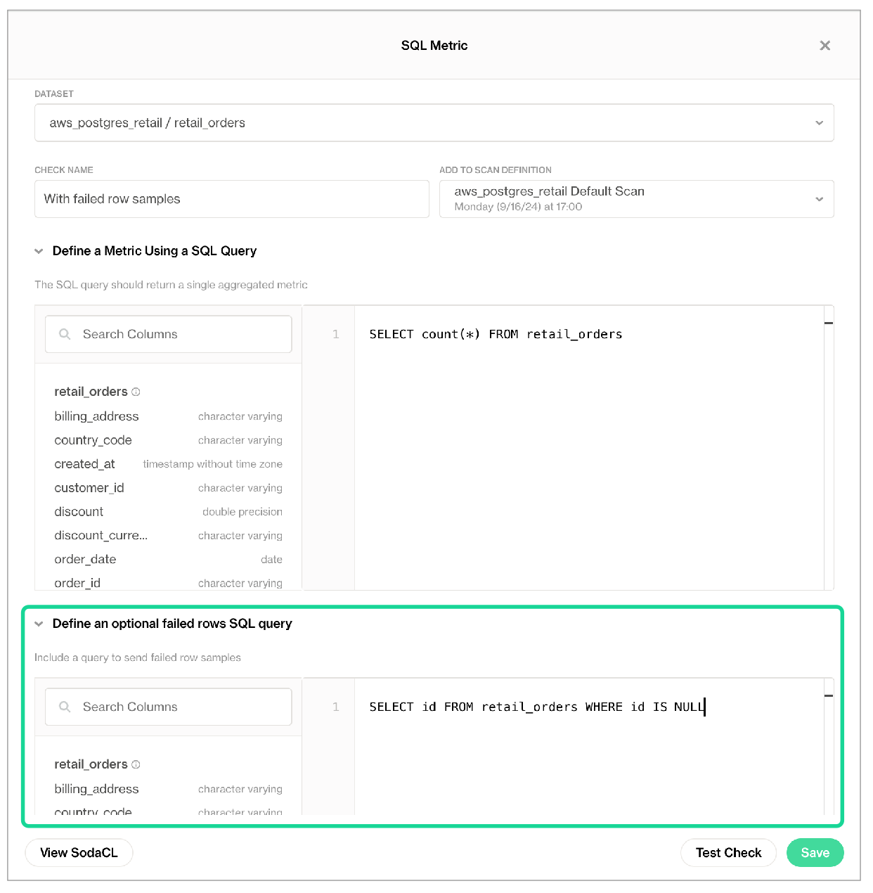 To add a custom failed row sample query to a user-defined check using SodaCL, add a failed rows query configuration as in the following example.