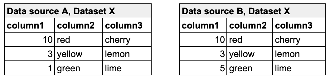 For example, the following check compares the entire contents of dataset Y in data source A and dataset Y in data source B. Though the contents of the rows match exactly, one dataset contains additional rows, so it is not an exact match and the reconciliation check fails with a numeric value of 2.