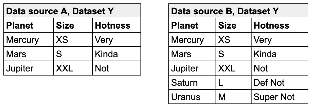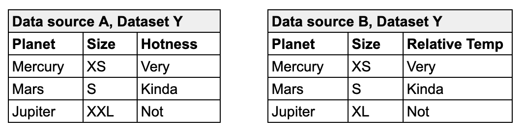 In the example below, the first check applies a deepdiff strategy and compares only the contents of the listed columns, mapping the columns according to the order in which they appear in the list– Planet to Planet, Hotness to Relative Temp. This check passes because the values of the mapped columns are the same.