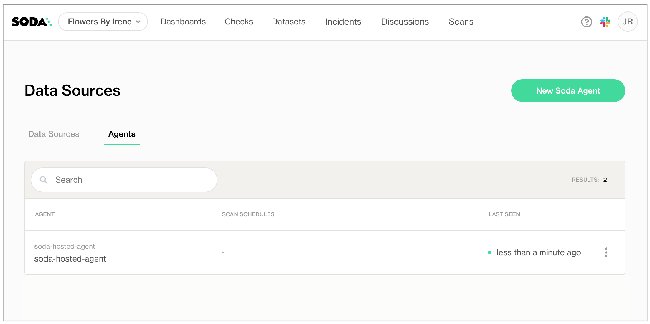In the Agents tab, confirm that you can see your Soda-hosted agent and that its status is "green" in the Last Seen column.