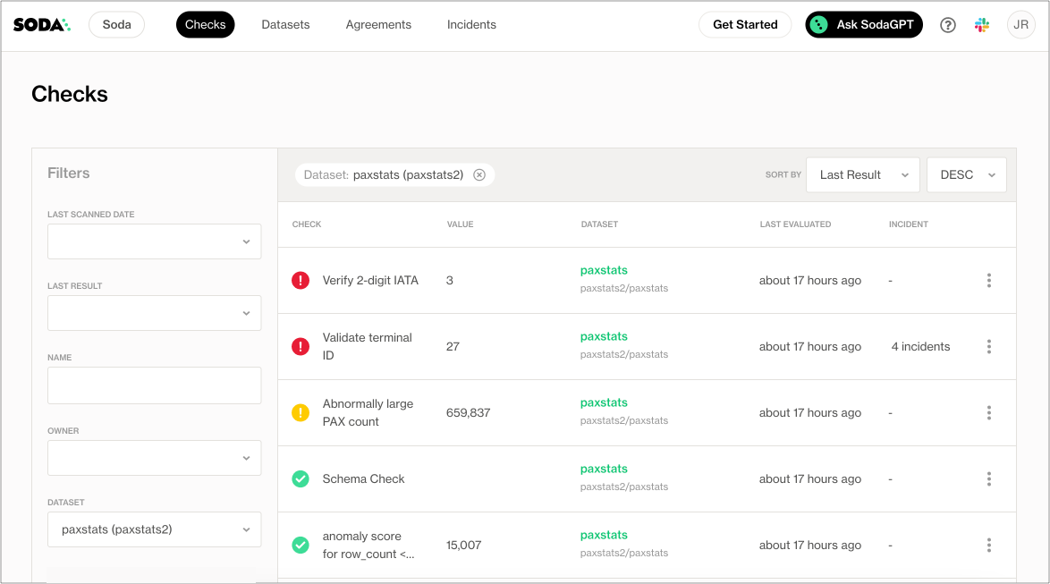 In their Soda Cloud account, the Engineer clicks Checks to access the Checks dashboard. The checks from the scan that Soda performed during the scan appear in the table where they can click each line item to learn more about the results, as in the example below.