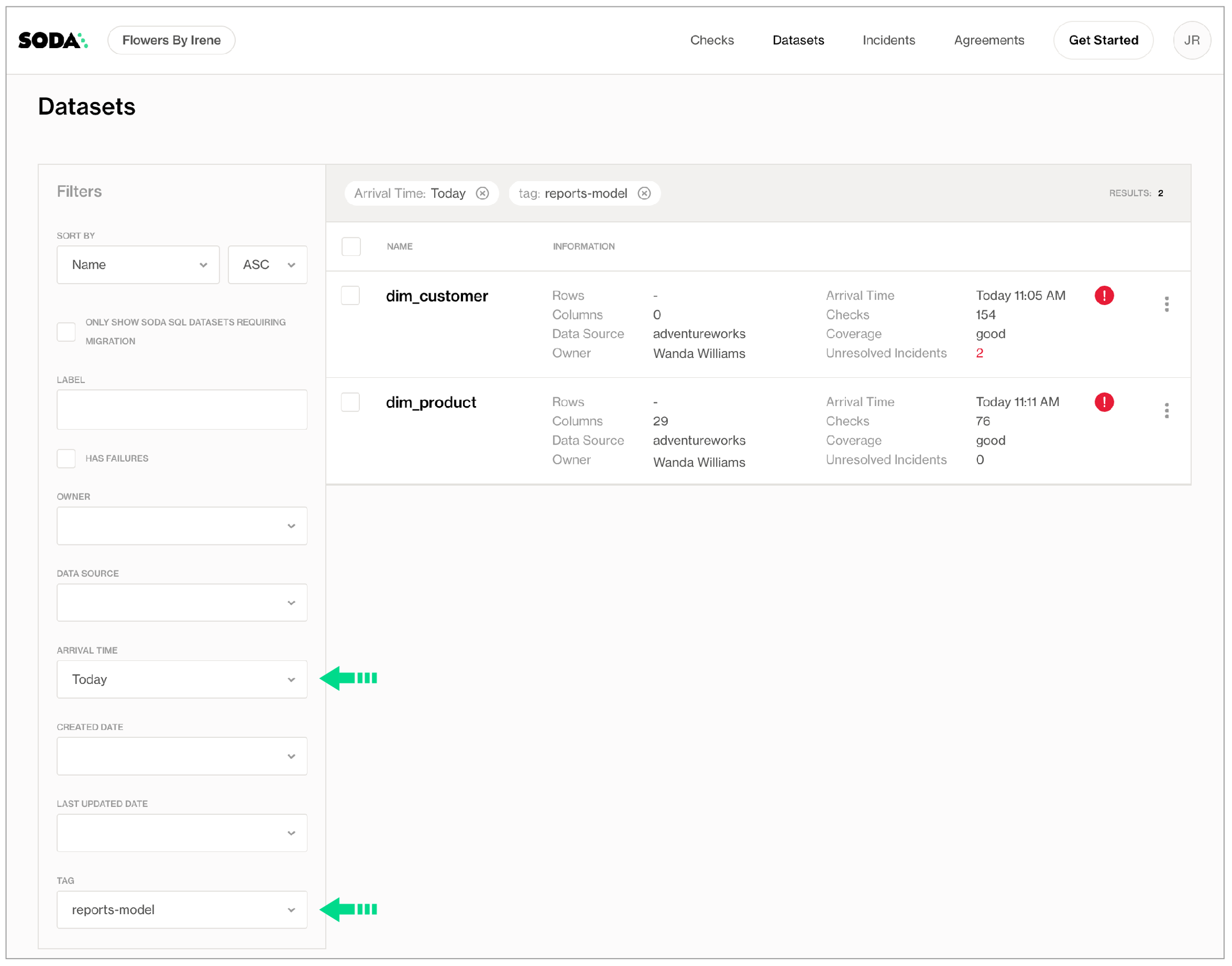 fact_product_category, the dbt model that uses this dataset, and a tag to indicate the kind of data that Soda is scanning,raw,transformedorreporting, then saves. They repeat these steps to add tags to all the datasets in their Soda Cloud account.Navigating again to the Datasets page, they use the filters to display datasets according to Tags and Arrival Time to narrow the search for the most recent quality checks associated with their models which have failed or warned.