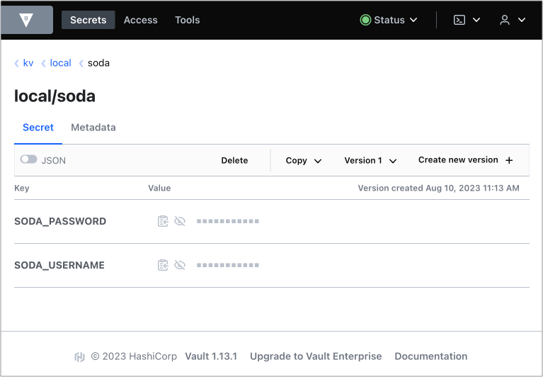 kv/local/sodato see the example username and password secrets in the vault. If you wish, you can set new secrets that the Soda Agent can use.