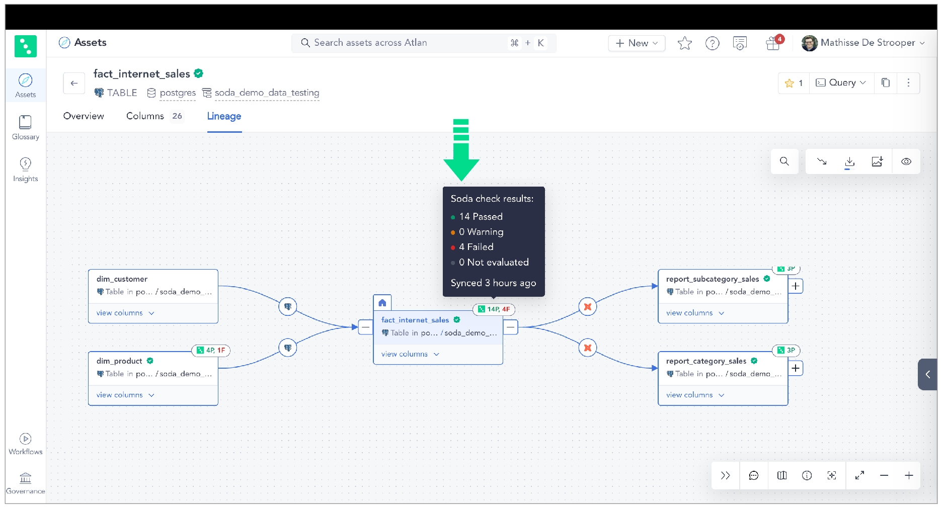 Use Soda Cloud to flag poor-quality data in lineage diagrams.