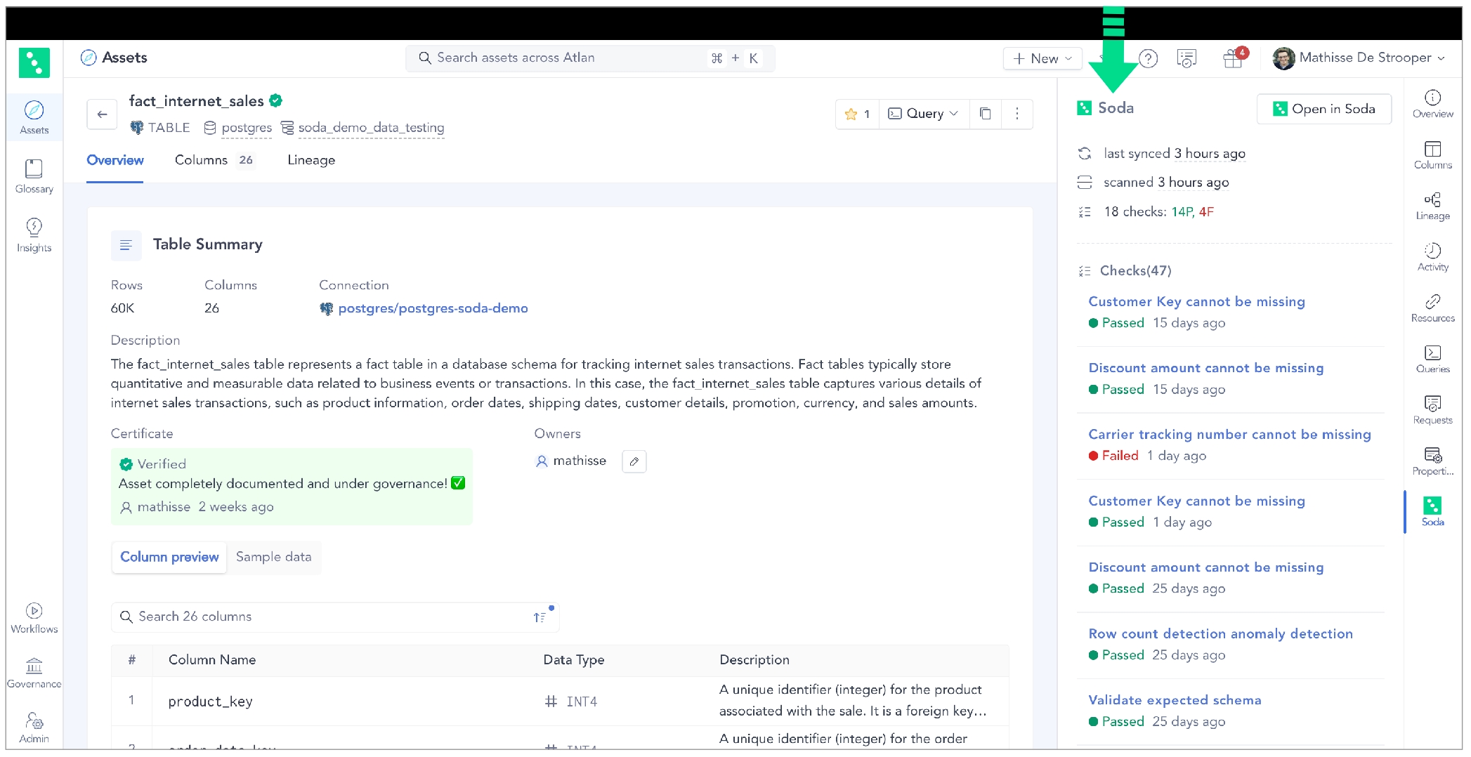 Integrate Soda with Atlan to access details about the quality of your data from within the data catalog.