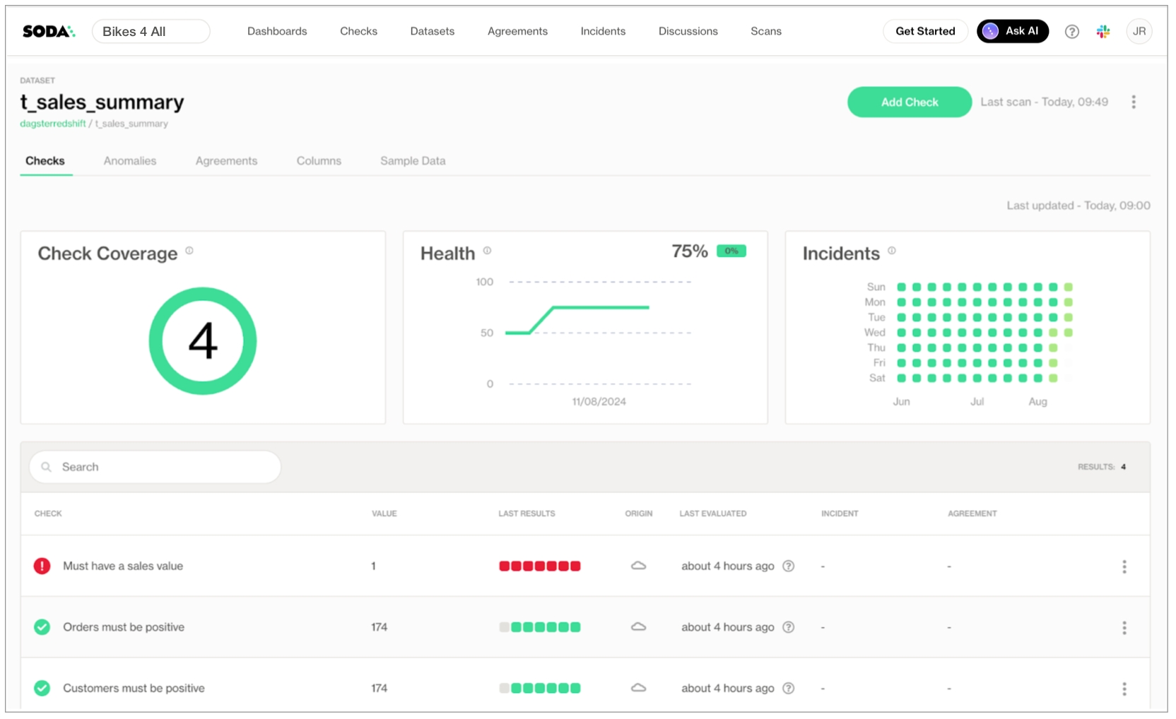 To review check results from the latest Soda scan for data quality, along with the historical measurements for each check, both Data Analysts and Data Engineers can use Soda Cloud.