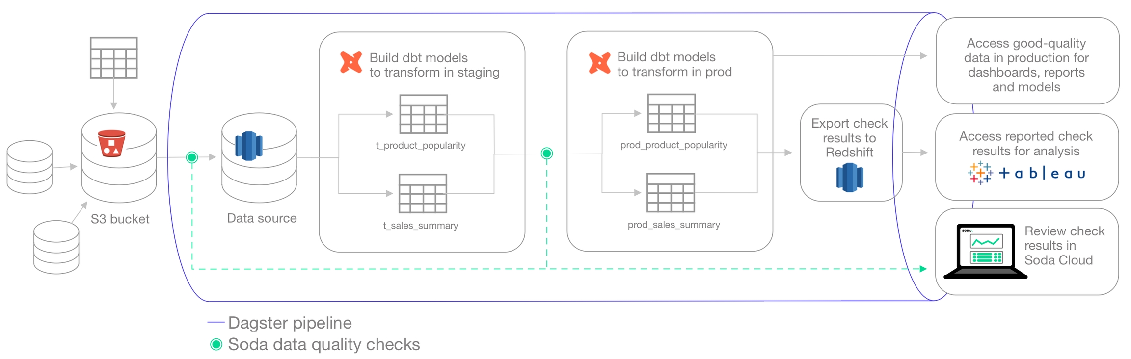 The instructions below offer an example of how to execute several Soda Checks Language (SodaCL) tests for data quality at multiple points within a Dagster pipeline.